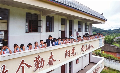 近日,臘福小學(xué)師生課間在教學(xué)樓走廊放松眼睛(無人機照片)。