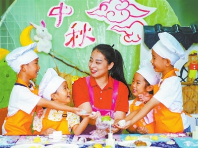 9月25日,江蘇省泰州市姜堰區(qū)第三實(shí)驗(yàn)幼兒園的小朋友們體驗(yàn)制作月餅。 周社根 攝
