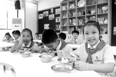 玉林市玉東新區(qū)實(shí)驗小學(xué)三年級學(xué)生在教室用中餐。玉林市教育局供圖