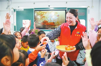 10月21日,在江蘇省如皋市白蒲鎮(zhèn)蒲西小學(xué),志愿者帶領(lǐng)學(xué)生近距離觀察柿子。當(dāng)日,該校開展“迎霜降節(jié)氣 學(xué)民俗知識”主題活動,通過朗誦相關(guān)古詩歌、賞菊花等形式,向?qū)W生普及節(jié)氣知識和民間習(xí)俗。徐慧 攝