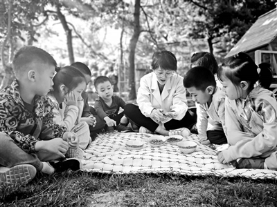 保育員王淑紅原來(lái)在服裝廠工作,懂裁剪技術(shù)。一次,教師李敏參加青年教師基本功大賽,需要沙包教具。為讓布料、大小規(guī)格更加合適,王淑紅參與到了教學(xué)現(xiàn)場(chǎng)中來(lái)。了解教師的要求后,她連夜縫制了20個(gè)沙包,保證了第二天的教學(xué)活動(dòng)順利完成。就這樣,保育員把傳統(tǒng)手藝變成教育手段,和專(zhuān)任教師一同站在了教學(xué)現(xiàn)場(chǎng)。