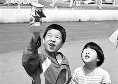 ①一對(duì)小兄妹測(cè)試太陽(yáng)能衛(wèi)星模型。