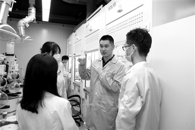 圖為深職大特聘教授滕超與團隊成員在實驗室探討材料配方方案。 學(xué)校供圖