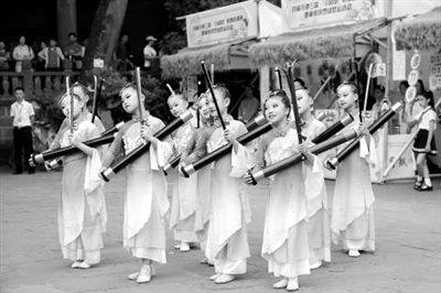 成都市龍江路小學分校竹琴社團的同學們在武侯祠表演。學校供圖
