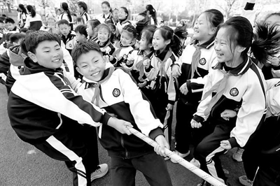 大圖:近日,在山東省棗莊市市中區(qū)東湖小學,學生們在課間進行拔河運動。