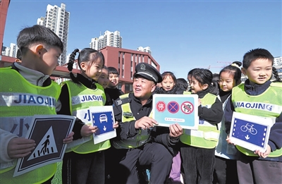 11月27日,河北省邯鄲市交巡警支隊(duì)民警教邯山區(qū)渚河路第二小學(xué)學(xué)生識(shí)別交通標(biāo)志。 郝群英 攝