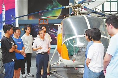 課程組教師在航空航天館內(nèi)的直升機(jī)(由南航師生研制的我國第一架自主設(shè)計(jì)制造的直升機(jī)“延安二號(hào)”)旁授課。資料圖片