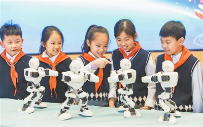 近日,江蘇省海安高新區(qū)實(shí)驗(yàn)小學(xué)的學(xué)生在校園科技節(jié)上觀看智能機(jī)器人表演。連日來,該校舉辦“科技潤童心 創(chuàng)新筑夢想”校園科技節(jié),學(xué)生通過視覺體驗(yàn)、科技創(chuàng)想等形式,感受科技魅力。翟偉凱 攝