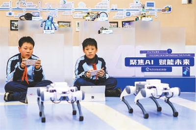 12月2日,杭州市保俶塔實驗學(xué)校的學(xué)生們在人工智能通識課上學(xué)習(xí)如何給機(jī)器狗編程。