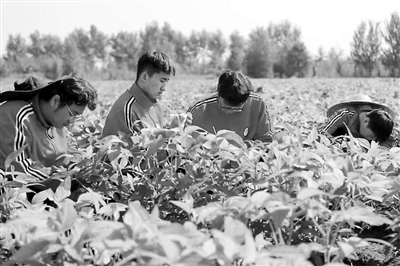 長春職業(yè)技術(shù)大學(xué)現(xiàn)代農(nóng)業(yè)專業(yè)學(xué)生在中科院地理所大豆實驗田實習(xí)人工授粉。