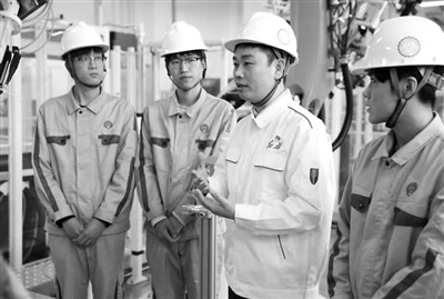 長春汽車職業(yè)技術(shù)大學(xué)優(yōu)秀校友、全國人大代表楊永修(右)在校中廠開展現(xiàn)場教學(xué)。