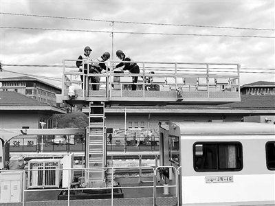 吉林鐵道職業(yè)技術(shù)大學(xué)鐵道供電技術(shù)專業(yè)學(xué)生在接觸網(wǎng)檢修作業(yè)車的檢修平臺上進(jìn)行更換整體吊弦作業(yè)。