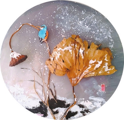 國畫裝置手工作品(主要材料:枯荷葉、泡沫板、宣紙)