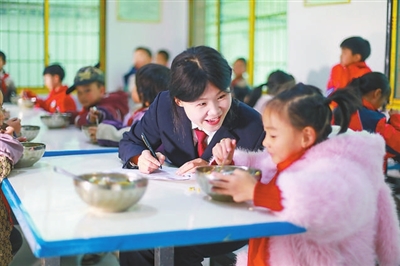 12月24日,檢察干警在貴州省黔西市綠化白族彝族鄉(xiāng)培育小學(xué)向?qū)W生了解吃營養(yǎng)餐的情況。 周訓(xùn)超 攝