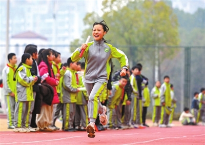 近日,湖南省長沙市開福區(qū)新竹第二小學(xué)開展“雋園歡騰慶元旦 騏驥昂首啟新程”活動。圖為學(xué)生在進行班級接力賽跑。郭立亮 攝