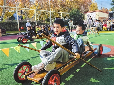 日前,浙江省杭州市蕭山區(qū)城廂幼兒園舉辦了第17屆運(yùn)動(dòng)節(jié)。教師和孩子們將傳統(tǒng)運(yùn)動(dòng)節(jié)變成了“項(xiàng)目化學(xué)習(xí)”大課堂。在這里,孩子們不只是運(yùn)動(dòng)員,更是賽場設(shè)計(jì)師、規(guī)則創(chuàng)造者、問題解決家,他們將運(yùn)動(dòng)演變?yōu)橐粓鋈诤咸骄?、協(xié)作與創(chuàng)造的綜合成長體驗(yàn)。圖為大班幼兒合作進(jìn)行劃龍舟比賽。 沈建紅 攝