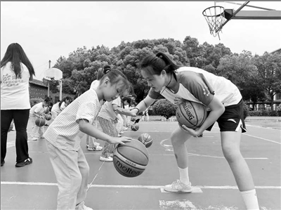 安徽師范大學(xué)“陽光體育”愛心夏令營(yíng)實(shí)踐團(tuán)成員(右一)教小學(xué)生打籃球。朱海兵 攝