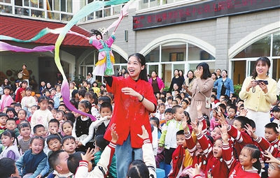 近日,福建省民間文藝家協(xié)會副主席、福建布袋木偶戲(廈門)省級代表性傳承人莊晏紅,帶領(lǐng)團(tuán)隊走進(jìn)廈門市集美區(qū)僑英中心幼兒園,為孩子們表演非遺布袋木偶戲。布袋木偶戲又名“掌中戲”,是閩南的國家級非物質(zhì)文化遺產(chǎn)。圖為演員手持精致的布袋木偶,向孩子們展示如何通過手指的精細(xì)操控,讓木偶做出眨眼、抬手、轉(zhuǎn)身等動作。 本報記者 熊杰 通訊員 杜雪鷹 攝影報道