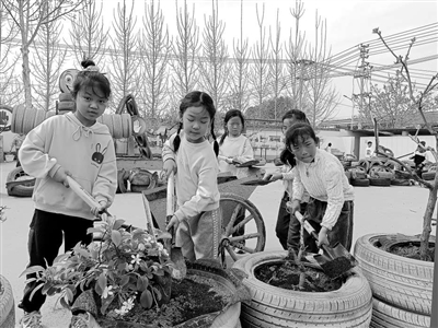 河南省濟(jì)源市梨林鎮(zhèn)梨林小學(xué)學(xué)生在廢輪胎里植綠。資料圖片