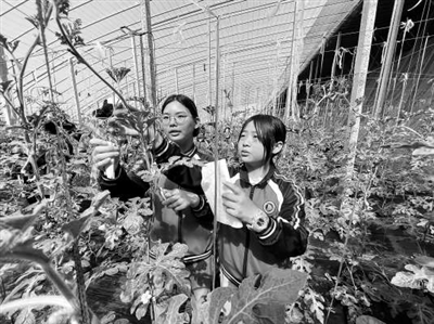 鄭州經(jīng)開區(qū)黃店一中的學(xué)生在為西瓜修剪枝蔓。資料圖片