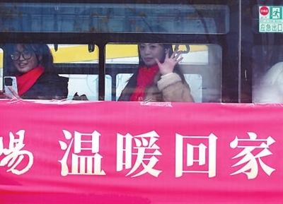 近日,阜陽幼兒師范高等專科學(xué)校,乘坐免費(fèi)大巴車前往火車站的學(xué)子向老師揮手告別。張洪金 攝