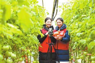 1月29日,在山東省濱州市博興縣店子鎮(zhèn)辛朱村,返鄉(xiāng)大學(xué)生志愿者在大棚里幫助農(nóng)民網(wǎng)絡(luò)直播推銷西紅柿。 陳彬 攝