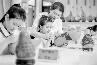 ①豫章師范學(xué)院附屬安義板溪小學(xué)教師指導(dǎo)學(xué)生進(jìn)行葫蘆雕刻。